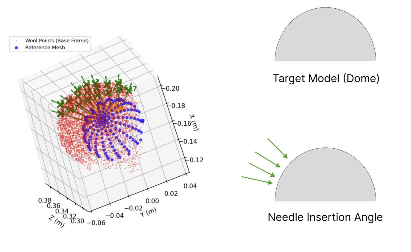 The system adjusts the needle insertion angle according to the surface normal of the target model, ensuring that each processed point is oriented at 90 degrees to the needle. In each round, the system proceeds through five views in the order of top, left, right, front, and back, processing one surface at a time. Each surface is further divided into left, center, and right regions, and a generated grid within each region is processed sequentially.
