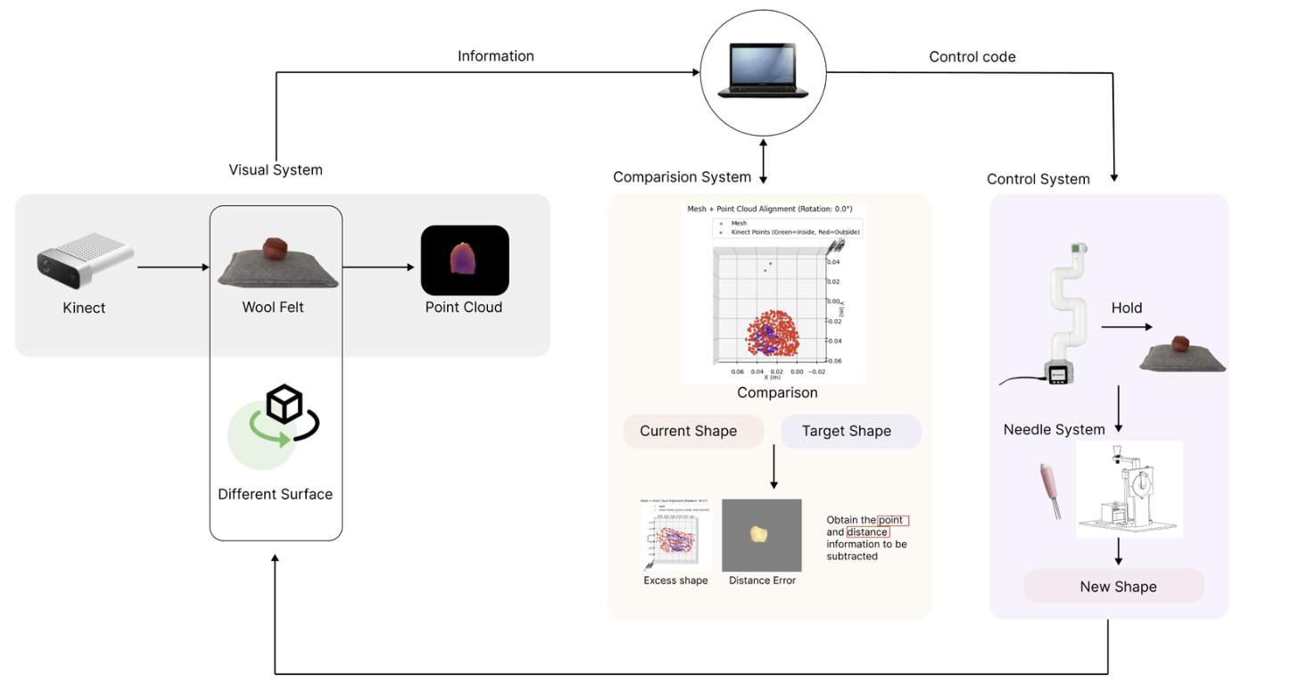 Previous research has mainly focused on designing a sequential system, using predefined needling setups or chemical methods to produce wool felt. These approaches effectively turn wool felt production into a linear system. My aim is to explore how we can compute within a non-linear system by mimicking the way humans create wool felt.