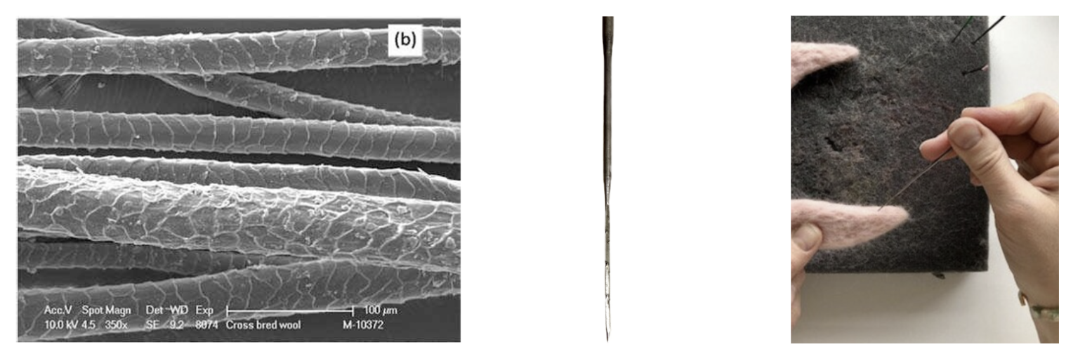 Figure 1. a. Wool fibers with microscopic surface scales. b. Felting needle with barbs. c. Manual needle-felting process that compresses fibers into a dense form.